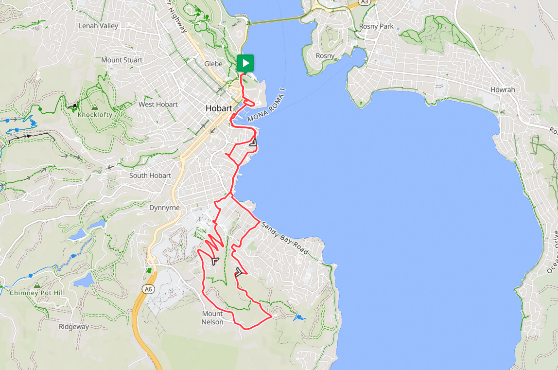 Meet ride leader David at 10.15am at the Cenotaph car park on McVilly Drive to ride around the waterfront to Mount Nelson Road to the Signal Station, then returning on Enterprise Fire Trail and residential streets to Sandy Bay Road .