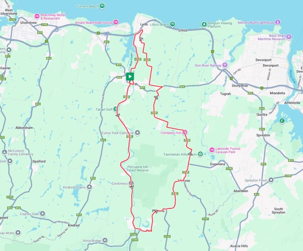 The longer, hilly 32km option heads uphill from Paloona Bridge to Melrose and Forthside. Those with surplus energy can continue via Braddons Lookout to Leith before dropping to Leith Road and returning along the river.