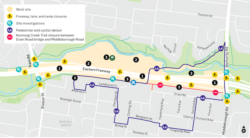 From now until mid-2027, the Koonung Creek Trail will be closed south of the Eastern Freeway between Eram Road Bridge and Middleborough Road.