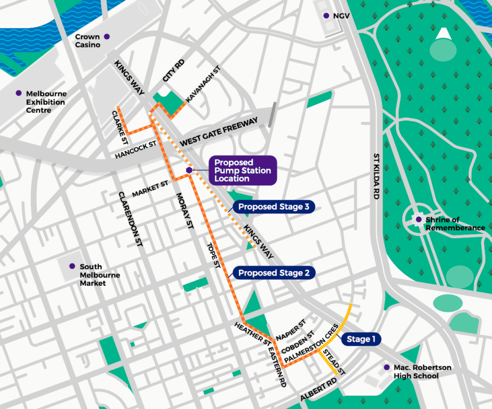 This stage will also include a proposed sewage pump station on Market Street, South Melbourne, near Kingsway.