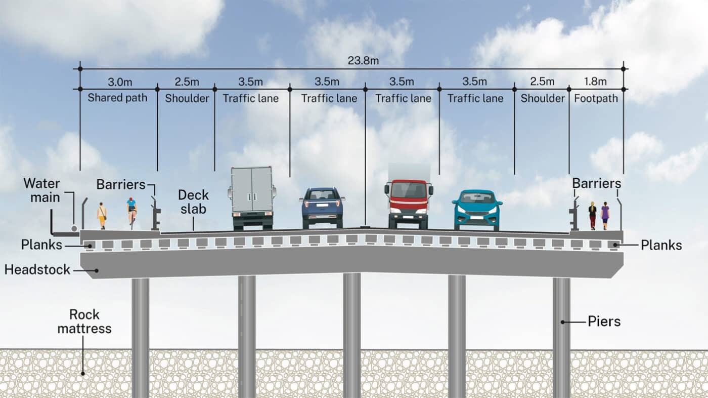 The new bridge will feature a 3-metre-wide shared path on the southern side of the bridge and a 1.8-metre-wide footpath on the northern side.