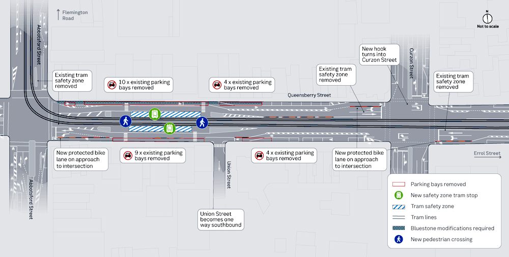 Queensberry Street, a popular east–west bike route, will see significant changes as old tram stops are replaced with new structures in changed locations.
