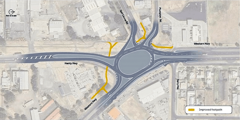 The point where the Henty Highway meets the Western Highway and well as Golf Course and Plumpton Roads handles 18,000 vehicles per day, 18% of which are trucks.