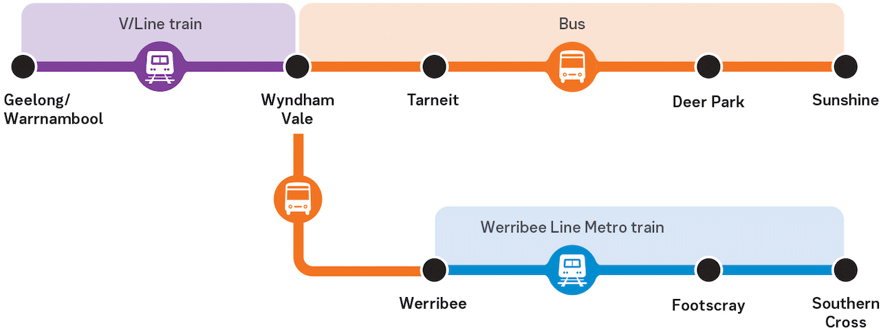 Consequently, Geelong Line trains will run between Waurn Ponds and Wyndham Vale only and travellers will take a shuttle bus between Wyndham Vale and Werribee.