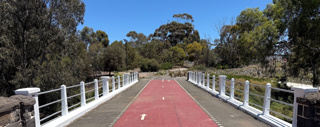 The bridge now carries the Kororoit Creek Trail over the creek, but once comprised part of the road from Melbourne to Geelong.