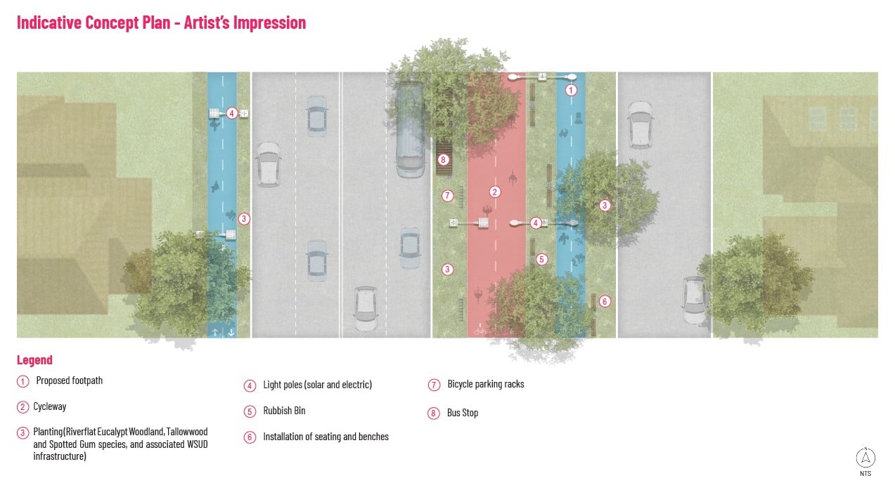 Stage 1 will include a dedicated cycleway, pedestrian crossings, new footpaths, new tree plantings, lighting, seating and benches.