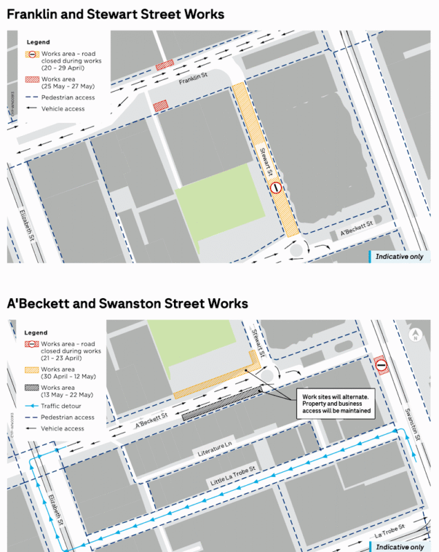 Teams will be working on roads and footpaths across A’Beckett, Stewart, Franklin and Swanston streets in stages between today, Tuesday 21 April 2026, and Wednesday 27 May 2026.