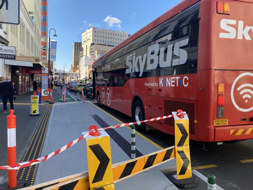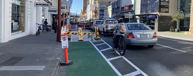 The section of trial between Victoria Street and Murray Street includes a partially separated bike lane on one side, platform extension bus stop, planter boxes and new footpath space for retailers to use.